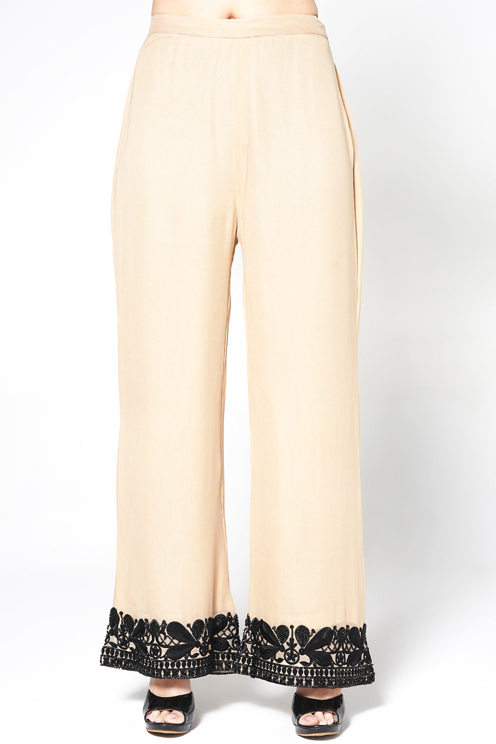 This Siyaah-O-Safeed cream georgette kurta set showcases a masterpiece of contrast, featuring bold floral motifs intertwined with delicate geometric lattice embroidery. The kurta is finished with elegant bead tassels at the hem, paired with wide-leg trousers and a sheer dupatta. A timeless choice for refined evening wear.