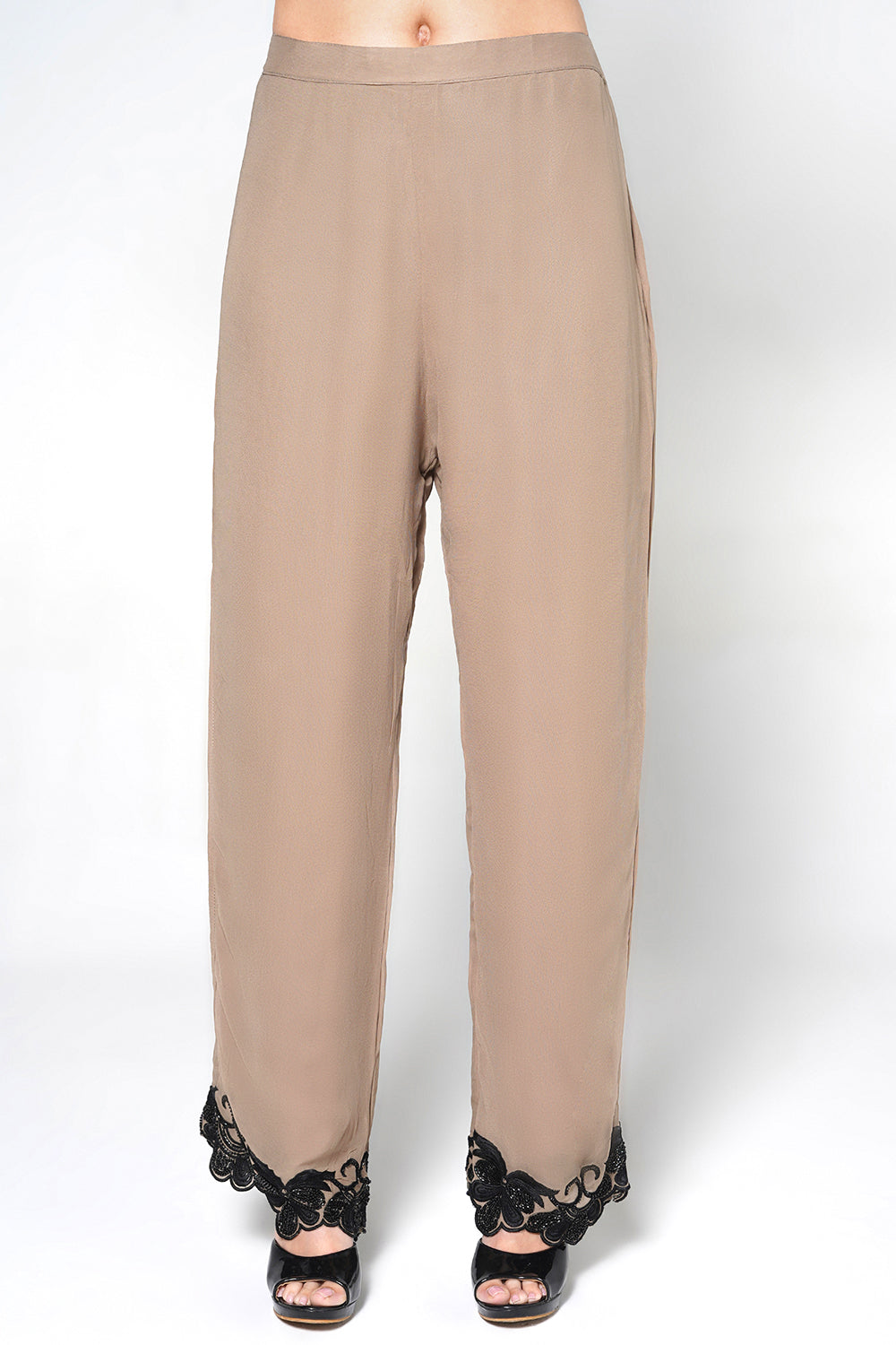 Exude sophisticated charm with this peach georgette suit from the Siyaah-O-Safeed collection. The design showcases dense black floral embroidery across the kurta and trouser cuffs, complemented by a scalloped hem. Complete with a matching dupatta featuring delicate bead trim, it’s a perfect choice for elegant festivities.