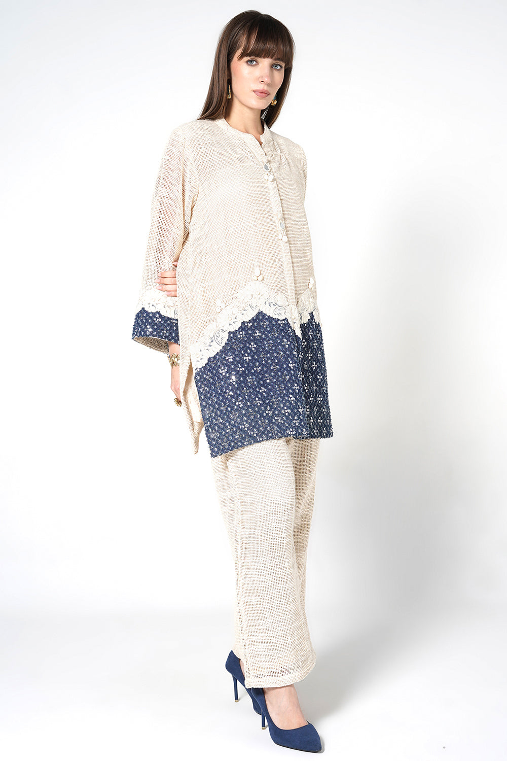 Resha Jute Fabric Lace Detail Designer Co-Ord Set Shirt Palazzo